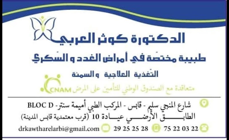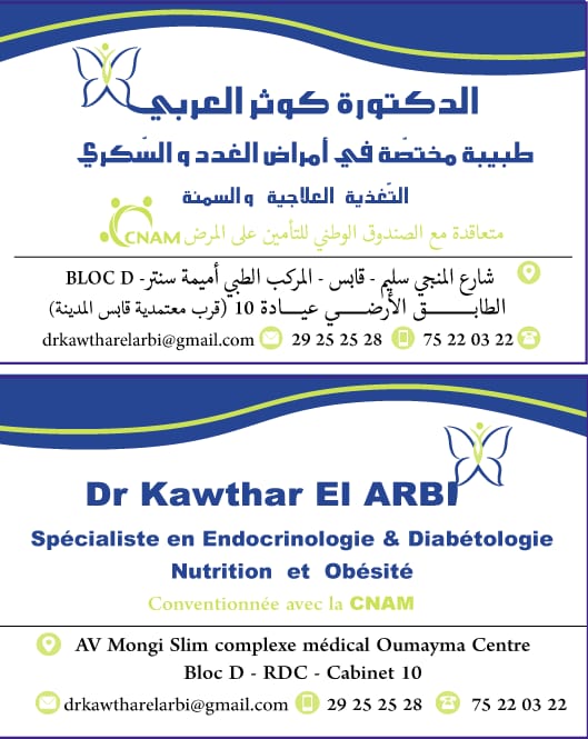 Dr Kawthar El Arbi Spécialiste Endocrinologie-Diabétologie-Obésité | الدكتورة كوثر العربي أخصائية أمراض الغدد والسكري والسمنة