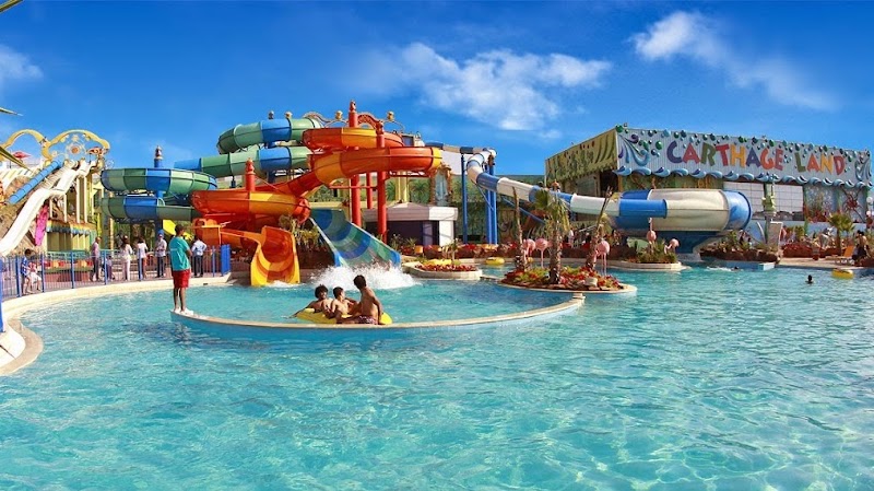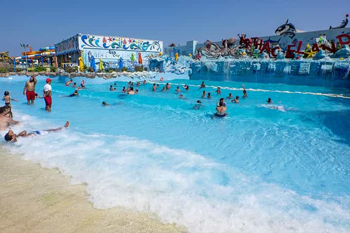 حديقة مائية خارجية تضم مجموعة متنوعة من المنزلقات والمسابح، بالإضافة إلى بعض ألعاب الركوب التشويقية